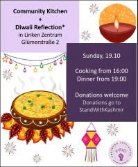 *** English version *** Join us to celebrate the Festival of Lights - Diwali with a community kitchen at the Linkes Zentrum (Glümerstraße 2) on 19th October, Sunday. We start cooking at 4pm and the dinner will be served at 7pm. We meet to eat together on Diwali and to reimagine and reflect on the festival. Whether you celebrate the festival or not, you are welcome to join the Küfa. *There will be reflections before dinner, you are also welcome to present! To present, you can dm us or just show up at the event :) The donations from the Küfa will go to StandWithKashmir. We stand in solidarity with communities such as from Kashmir, facing occupation and dispossession. We hope you see you there!