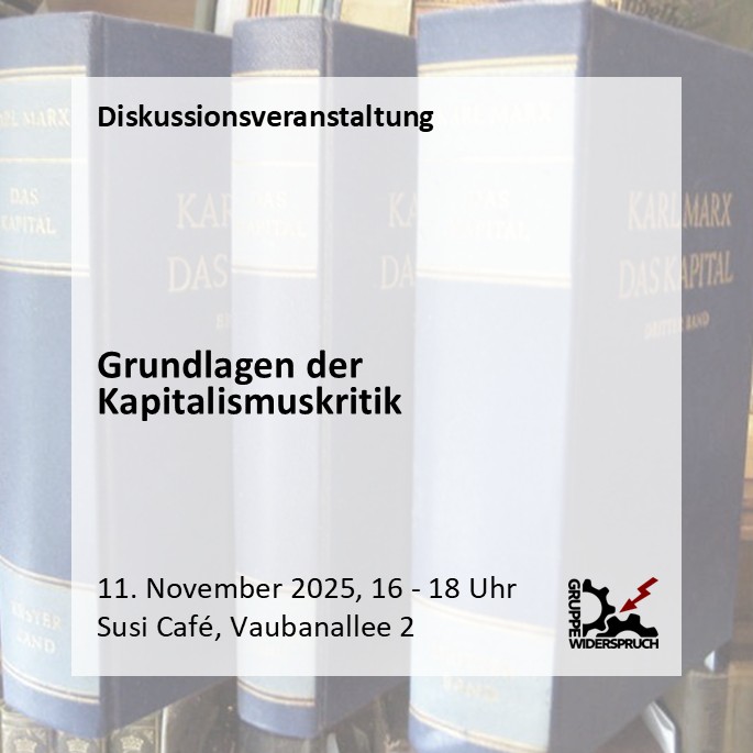 Am 11. November laden wir im Rahmen der Kritischen Einführungstage (KrEta) von 16:00 Uhr bis 18:00 Uhr im Susi Café (Vaubanallee 2) zu einer Diskussionsveranstaltung zum Thema "Grundlagen der Kapitalismuskritik" ein.