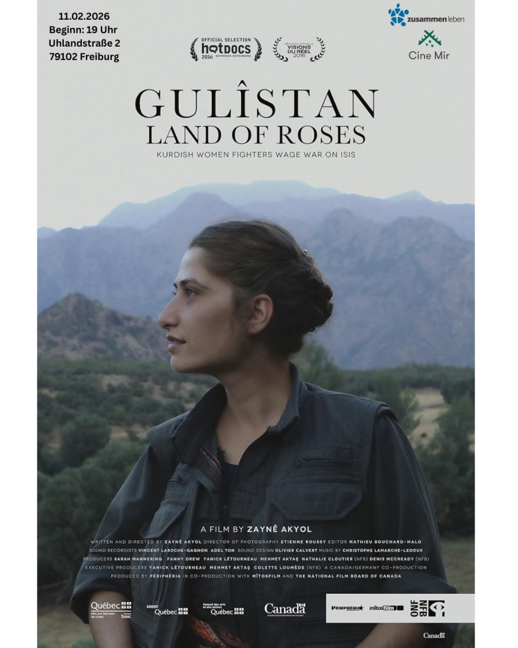 Zaynê Akyol | 2016 | Dokumentarfilm | Kanada, Deutschland | OmeU | 87 Min. Die Regisseurin Zaynê Akyol begleitet kurdische Kämpferinnen in den Grenzregionen des Irak und Syriens und wirft einen differenzierten, nahen Blick auf den Guerillakrieg. Neben der intensiven Vorbereitung auf Einsätze gegen den IS zeigt der Film auch alltägliche, intime Momente: Körperpflege, gemeinsames Lachen und ausgelassene Feiern mit ihren Kameraden. Die Protagonistinnen sprechen offen über ihre Ängste, Hoffnungen und Ideale – und geben einen seltenen Einblick in ihr Leben zwischen Kampf, Solidarität und Selbstbestimmung. Die Veranstaltung findet im Rahmen der Reihe "Cine Mir - Kurdische Filme in Freiburg" statt und wird kuratiert von Mehveş Öztürk und Elif Evin Göksungur. Wie immer gibt es zum Film ein warmes Essen.