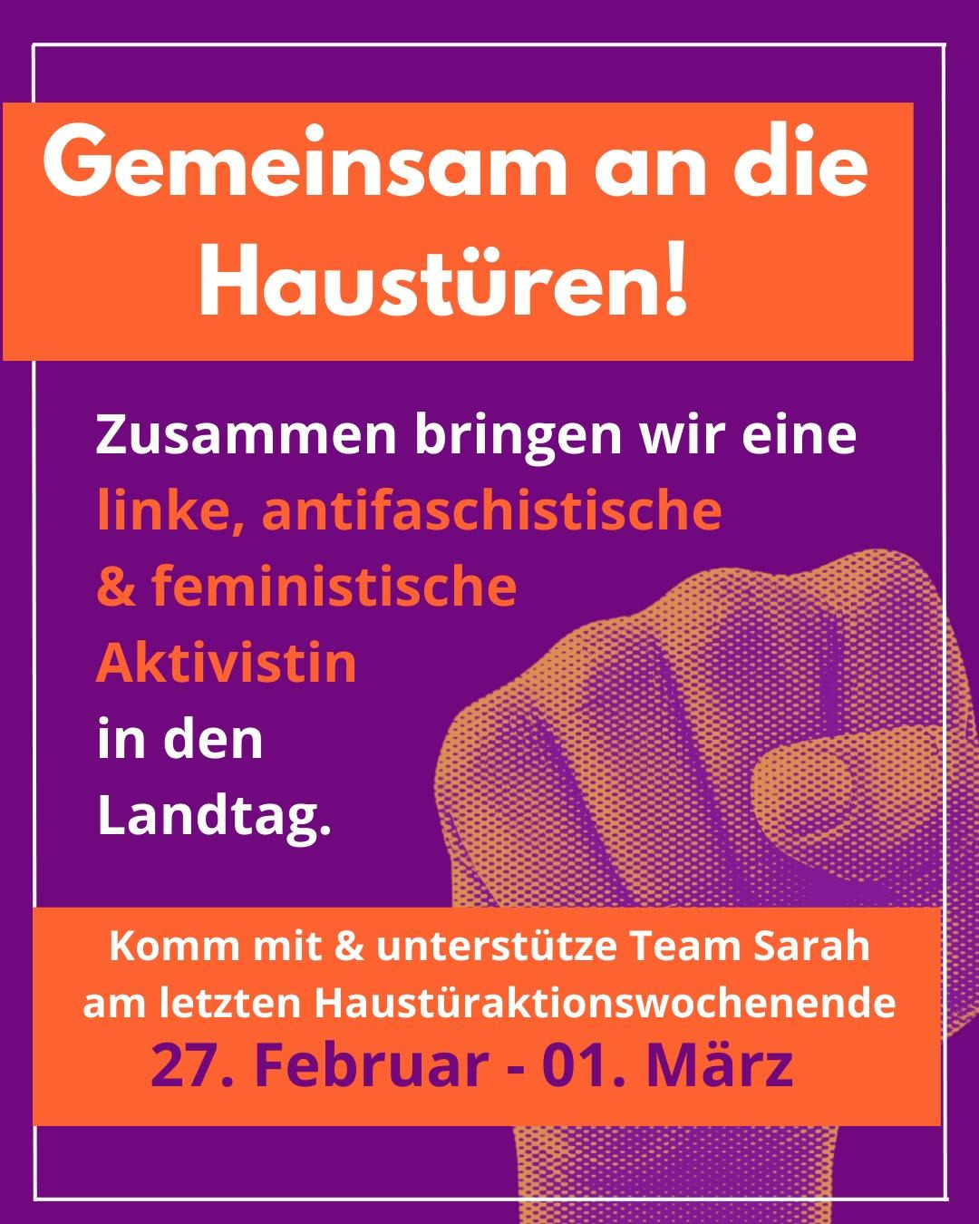 Nächstes Wochenende ist das finale Haustüraktionswochenende und es braucht jede einzelne Person, um unsere Genossin Sarah in den Landtag zu bringen!