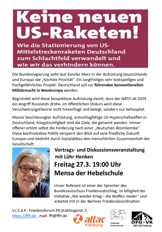 Der Referent ist Lühr Henken. Er ist einer der Sprecher des Bundesausschuss Friedensratschlag, ist Mitglied der Initiative „Nie wieder Krieg – die Waffen nieder“ und arbeitet mit in der Berliner Friedenskoordination.