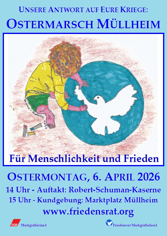 Der Friedensrat Markgräflerland und der DGB Markgräflerland laden die Bürgerinnen und Bürger der Regio ein, sich am Ostermarsch 2026 in Müllheim zu beteiligen