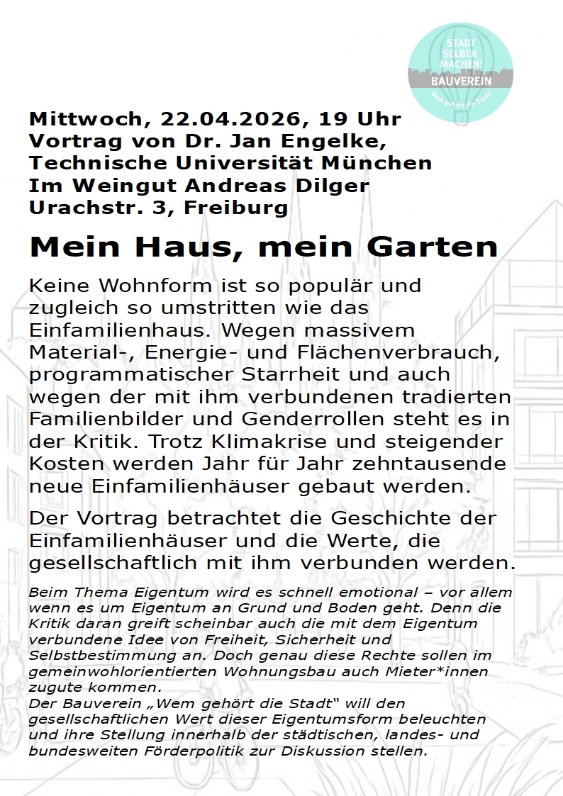 Der Bauverein „Wem gehört die Stadt“ will den gesellschaftlichen Wert dieser Eigentumsform beleuchten und ihre Stellung innerhalb der städtischen, landes- und bundesweiten Förderpolitik zur Diskussion stellen.