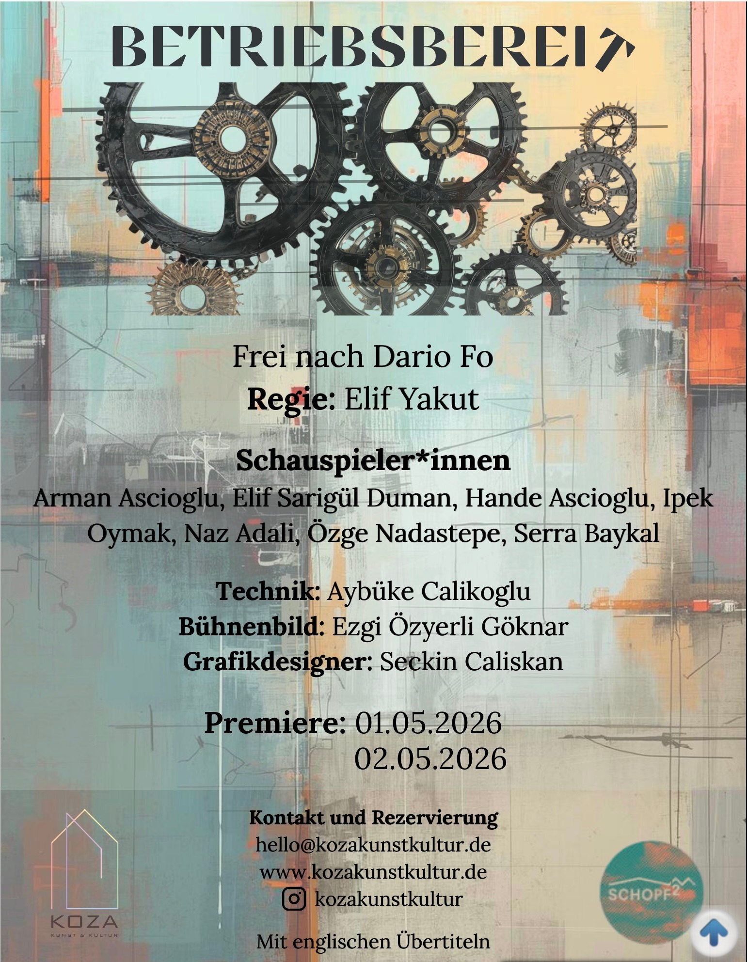 Die zweite Produktion des KOZA Theaters "Betriebsbereit" unter der Regie von Elif Yakut beleuchtet auf ironische Weise die Bemühungen von Macht, Ordnung und dem Menschen "betriebsbereit" zu bleiben. Zu sehen am Freitag, 1. & Samstag 2. Mai jeweils um 19.30 Uhr im Schopf2, Schopfheimer Straße 2, 79115 Freiburg. Spenden erwünscht.