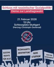 Landesweite DEMONSTRATION– Schluss mit rassistischer Sozialpolitik! NEIN zur Bezahlkarte und zur GEAS-Reform Samstag, 21.02.26 um 09:00 Uhr Gemeinsame Anreise aus Freiburg Stuttgart