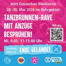 Infoveranstaltung: Freiburg fährt zu Ende Gelände Dienstag, 28.04.26 um 18:30 Uhr Mittwoch, 13.05.26 um 19:00 Uhr Jetzt Gasausbau Blockieren! 28.-30. Mai 2026 im Ruhrgebiet. Linkes Zentrum Freiburg (LIZ)