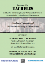 Straflose Tierquälerei? – Die Nutztierhaltung in Deutschland Mittwoch, 29.10.25 um 19:15 Uhr Universität Freiburg Kollegiengebäude I Hörsaal 1199 (KG I, Uni Freiburg)