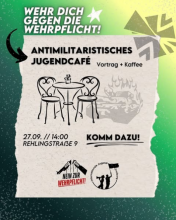 Antimilitaristisches Jugendcafé Samstag, 27.09.25 um 14:00 Uhr - Sa., 27.09.2025 - 15:00 Komm dazu! Haus des Engagements Eingang über den Innenhof