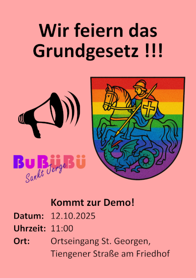 das Bunt-Bürgerliche Bündnis Sankt Jerge lädt am Sonntag, dem 12.10. zu einer weiteren Versammlung gegen die extremistischen Umtriebe der Reichsbürger, die weiterhin fast jeden Sonntag am Ortseingang von St. Georgen ihren "stillen Protest" gegen das Grundgesetz und für die Rückkehr zur Reichsverfassung von 1871 abhalten.