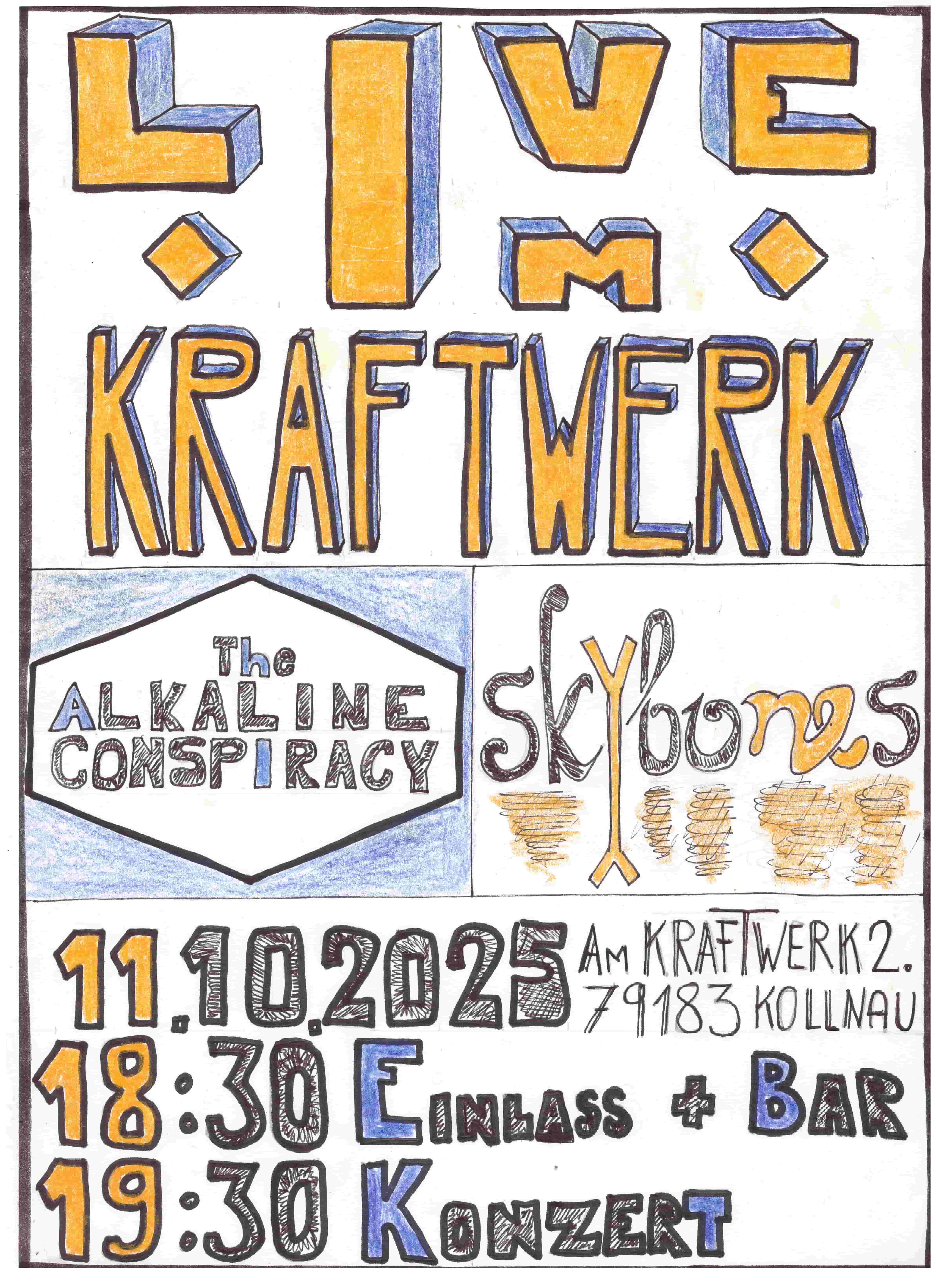 Live IM Kraftwerk. Skybones und Alkaline Conspiracy. Rock/Psychedelic. Rumhängen am Kraftwerk mit tighter Mukke und kleiner Bar. Konzertabend für Liebhaberinnen der guten Musik und Symbadischer Atmo!