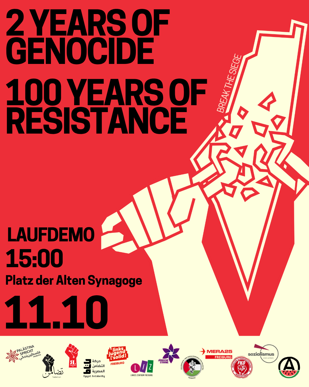 Diese Demo ist organisiert von Palästina Spricht Freiburg in Kooperation mit folgenden Organisationen: Tadamun Freiburg, Revolutionäre Linke, Egypt Solidarity Movement, Linksjugend ['solid] Freiburg, Linkes Zentrum Freiburg, Judische Stimme für gerechten Frieden in Nahost, Healthcare Workers for Palestine, Mera25 Freiburg, Föderation klassenkämpferischer Organisationen, Sozialismus von Unten, und Anarchists for Palestine Freiburg.