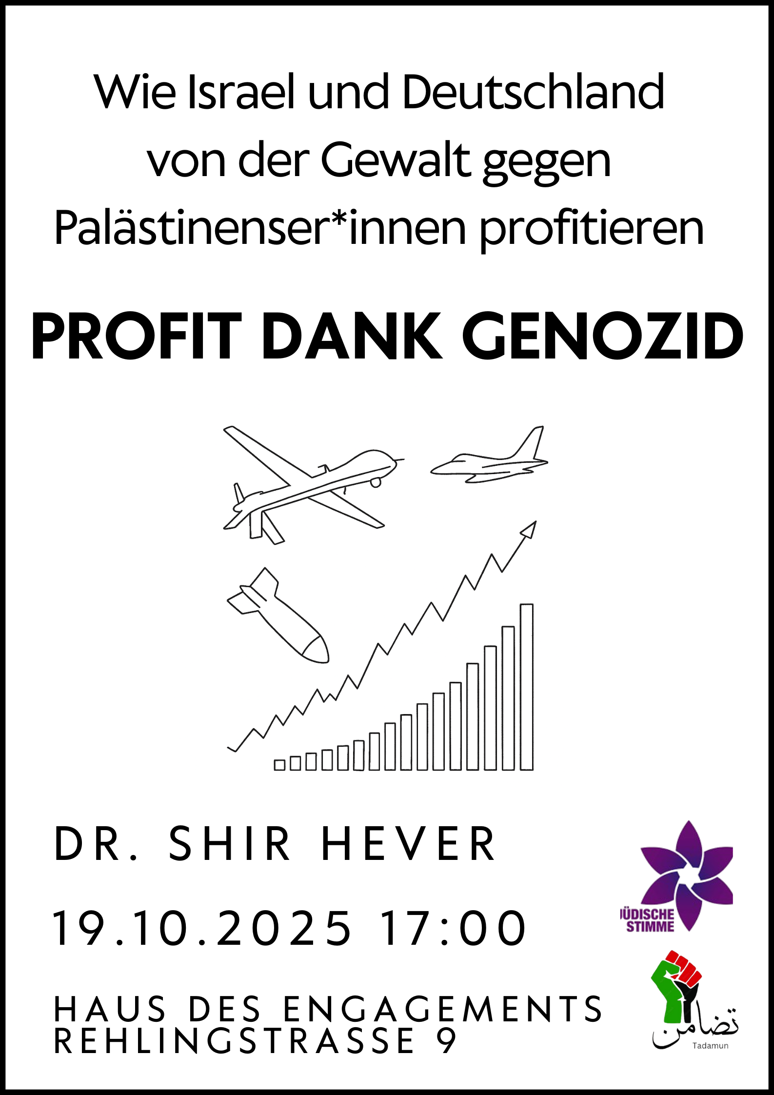 Die Veranstaltung wirft einen kritischen Blick auf die wirtschaftlichen und politischen Verflechtungen zwischen Deutschland und Israel. Im Zentrum steht die Frage, wie deutsche Firmen und Institutionen von dem seit zwei Jahren andauernden Völkermord in Palästina profitieren und welche Rolle dabei Rüstungsgüter, „Dual-Use“-Produkte und Sicherheitskooperationen spielen.