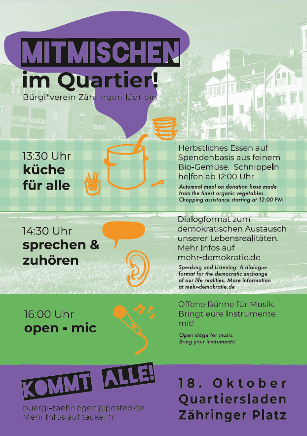 What: Get involved in your neighborhood – Zähringen: Cooking for everyone, “Talking and listening” & Open Stage