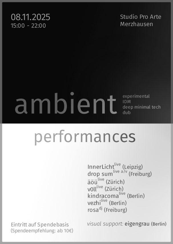Samstag, 08.11.25 um 15:00 Uhr - 22:00 Studio Pro Arte, Merzhausen Elektronische Musik Richtung experimental, ambient, IDM, dub, minimal techno, mit visuellen Begleitung. Euch erwarten einzigartige Klang- und Visual-Erlebnisse! Type of Event Konzert Party
