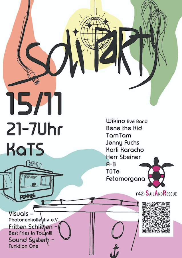 Um diese Einsätze zu finanzieren sind wir auf Spenden angewiesen und laden deswegen herzlich zu unserer Soli-Party am 15.11. ab 21 Uhr in der KaTS ein! Wir haben eine kleine Info-Veranstaltung, Pommes (!!) und vor allem sehr nice Musik für euch im Angebot.