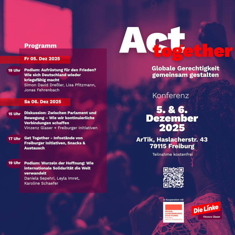 Mit der Konferenz „Act together – Globale Gerechtigkeit gemeinsam gestalten“ schaffen wir einen Raum, in dem soziale Bewegungen, Zivilgesellschaft und Parlament zusammenkommen, um Wege internationaler Solidarität zu erkunden. Wir wollen diskutieren, wie wir der zunehmenden Militarisierung in Deutschland entgegentreten können und wie sich internationale Solidarität durch unsere lokalen Kämpfe stärken lässt. Wir möchten unsere Arbeit vor Ort mit globalen Perspektiven verbinden. Perspektiven, aus denen Widerstand, Gemeinschaft und gesellschaftliche Veränderung wachsen können.