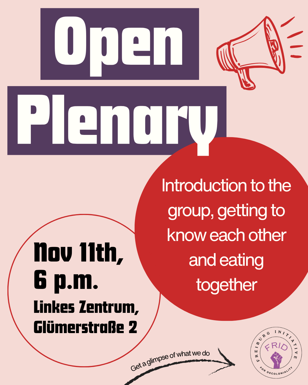We are happy about new faces, new perspectives, new friends to join us for collectively organizing for decolonial action. We will have an introductory plenary for an hour and then dinner together!