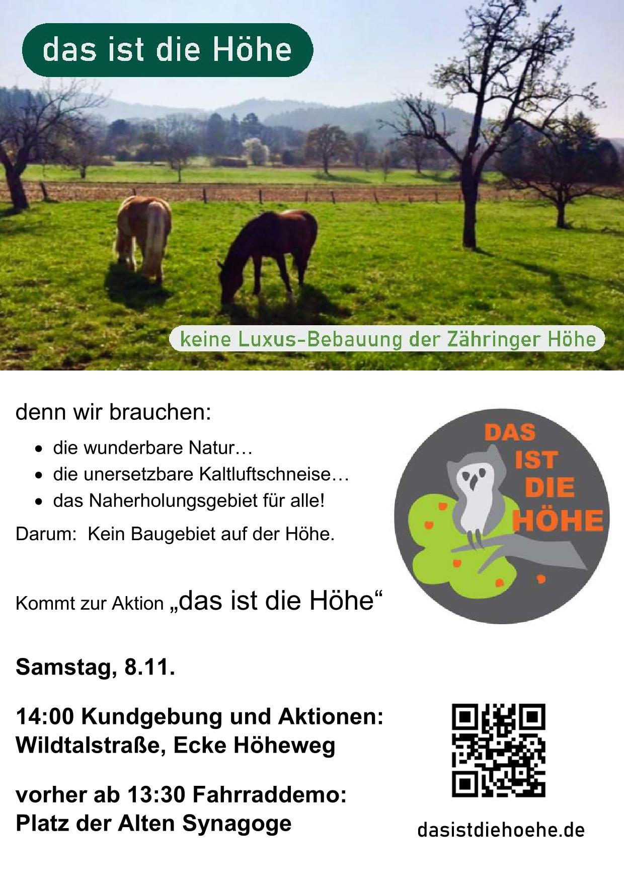 Wir im Bündnis „das ist die Höhe“ zusammengeschlossenen Gruppen aus Zähringen, Freiburg und Umgebung wollen das nicht hinnehmen und lehnen die von der Stadt geplante Bebauung ab.