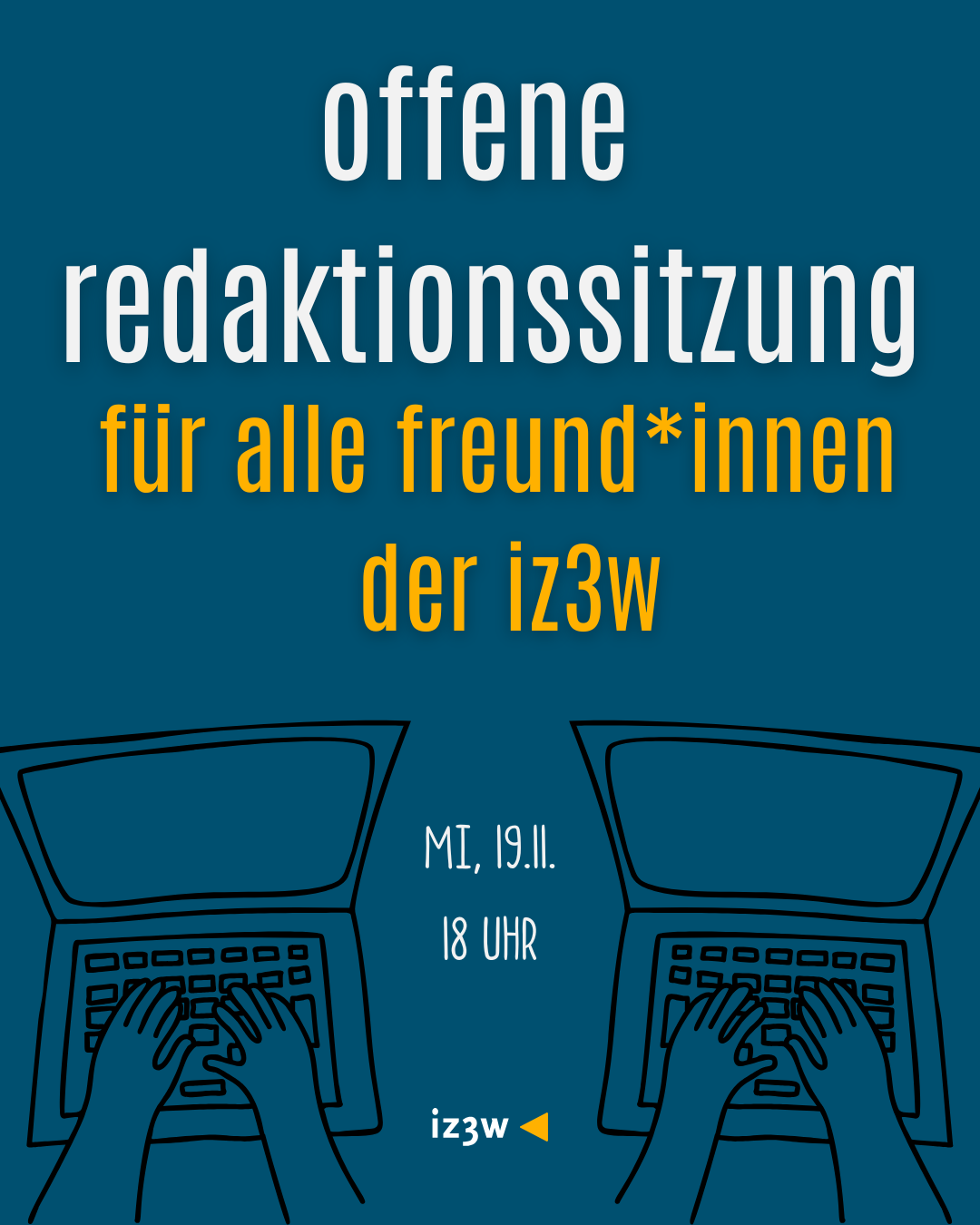 Die Offene Redaktionssitzung im iz3w hat eine lange Tradition. Hier können die Leser*innen und Freund*innen der iz3w ihren Senf dazugeben, mitbestimmen, was für Inhalte behandelt werden und mit den iz3wler*innen diskutieren. Für die Sitzung im November haben wir folgendes Programm geplant: