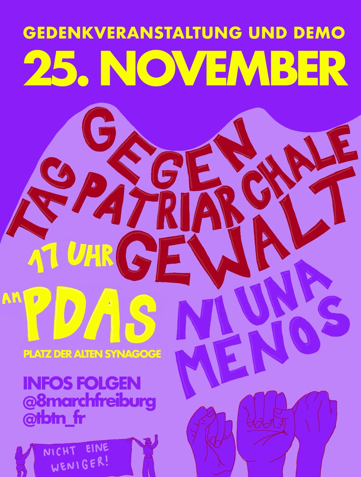 English: We are angry, we are grieving, we are many! November 25 is the International Day for the Elimination of Patriarchal Violence. It is a day to draw attention to the violence and dangers that stem from patriarchal structures. At the same time, it creates a space to express the feelings that come with this violence — our pain, our rage, our grief. Together we want to use November 25 to remember those affected, and to bring our anger at patriarchy and the state to the streets. Because in a time when right-wing and anti-feminist forces like the AfD and CDU are gaining strength, we must act together — decisively and in solidarity! Patriarchal violence describes the violence and threats FLINTAs (women, lesbians, inter, trans* and agender people) are exposed to through patriarchal and misogynist structures and behaviors. This includes sexualized violence, domestic violence, control over our bodies and choices — and so much more. The most extreme form of patriarchal violence is feminicide. Every day, a man attempts to kill a FLINTA* person — every third day, he succeeds. At the same time, women’s shelters are being systematically defunded. These are not isolated incidents — these are murders with a system! On October 11, in Bollschweil — right here in our region — a girl was murdered by her father. A girl who lost her life to the violence of a man. FLINTA*s affected by racism and other forms of marginalization face an even greater risk of patriarchal violence. And yet, their specific experiences remain ignored in political discourse. On the contrary, figures like Friedrich Merz openly voice sexist and racist statements without consequence. We want to use this day to show that we are many, and to remember all those who are no longer among us because of patriarchal violence — because of feminicides. We begin with a memorial for those affected by patriarchal violence, as we deeply mourn their absence. At the same time, we carry so much anger within us. How can there be so many victims? Why is patriarchal violence part of daily life for so many FLINTA* people — and yet in the end, they become nothing but numbers in statistics, “isolated cases,” or “family tragedies”? We want to channel our collective rage — because rage is the beginning of change. That is why, after the commemoration, we will take to the streets together — to make our anger visible, to make it heard. So come join us on November 25 at 5 p.m. at the PDAS to stand together against patriarchal violence. Together we are many. Together we can create change. After the memorial, the demonstration starts at 6 p.m.! Ni una menos — for us, and for those who can no longer be with us!