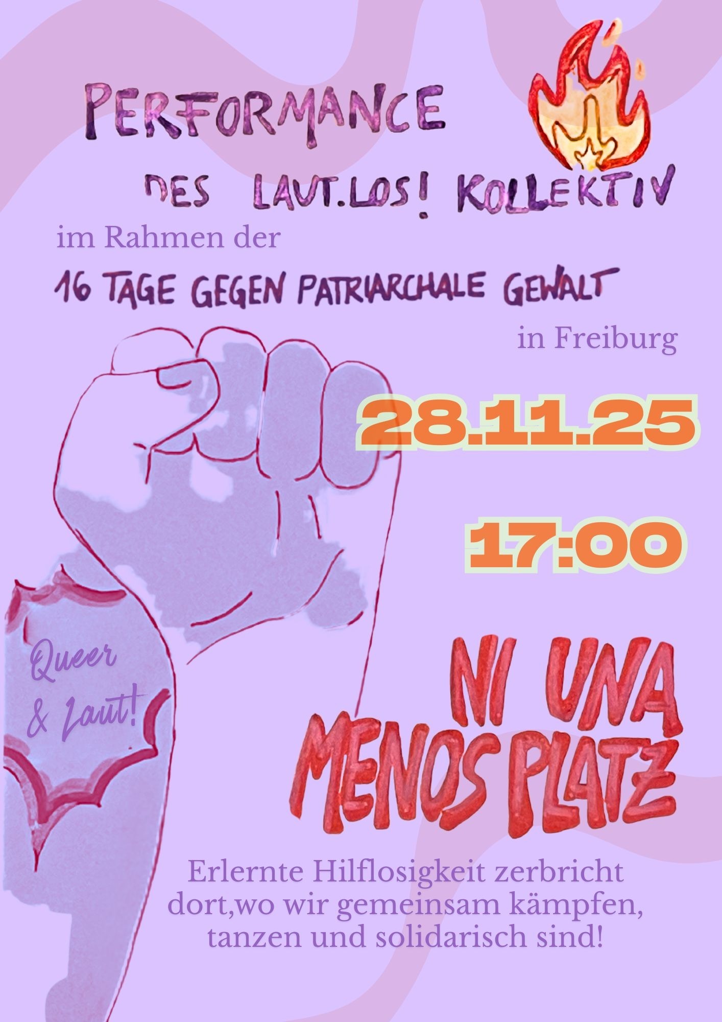 Laut.Los! ist ein feministisches und queeres Performance Kollektiv und möchte durch Tanz, Musik und Sprache auf die unterschiedlichen Formen patriarchaler Gewalt aufmerksam machen. Es wird auch um sexualisierte Gewalt gehen.