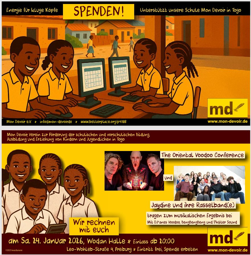 Am Samstag, 24. Januar 2026, ist es endlich wieder so weit: Die Mon-Devoir-Benefiz-Veranstaltung kehrt in die Wodan Halle Freiburg zurück! Freut Euch auf einen energiegeladenen Abend voller Musik, Begegnung und Engagement – alles zugunsten der Schule Mon Devoir in Togo.