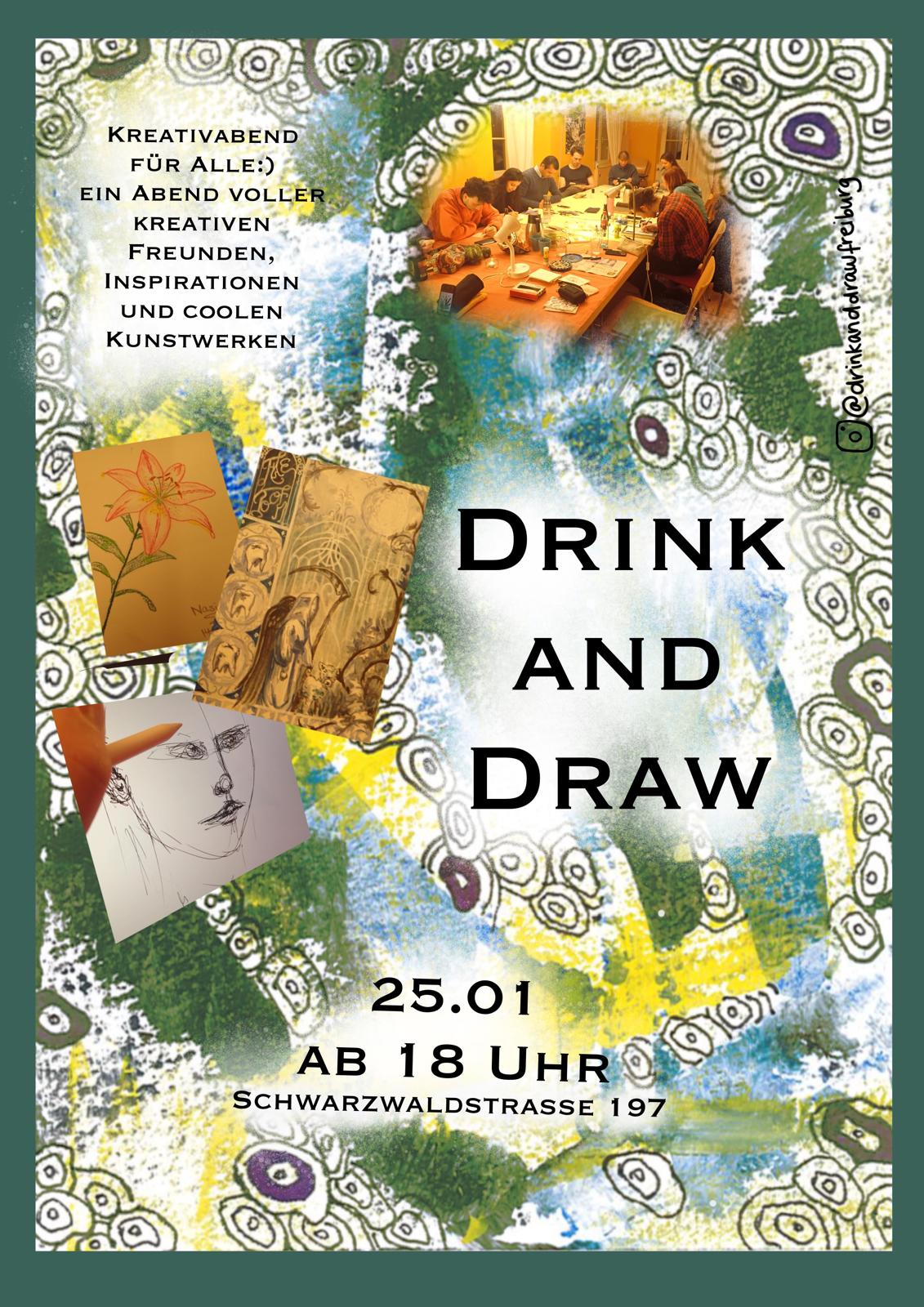 Drink and Draw ist ein offener Kreativtreff für alle den Spaß an kreativen jeglicher Art haben. Für einen Abend im Monat wird unser Raum zu einem gemeinsamen Wohnzimmer, indem die unterschiedlichsten Kunstwerke entstehen und Freunde mit gleichen kreativen Interessen sich treffen und inspirieren können.