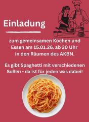 Donnerstag, 15.01.26 um 20:00 Uhr iEgonstrasse 54 in den Räumen des AKBN kommt gerne Vorbei es gibt Spaghetti mit verschiedenen Saucen. Jede und jeder ist willkommen. Barrieren: berollbar, barrierefreie Toilette Type of Event Essen, VoKü, Küfa