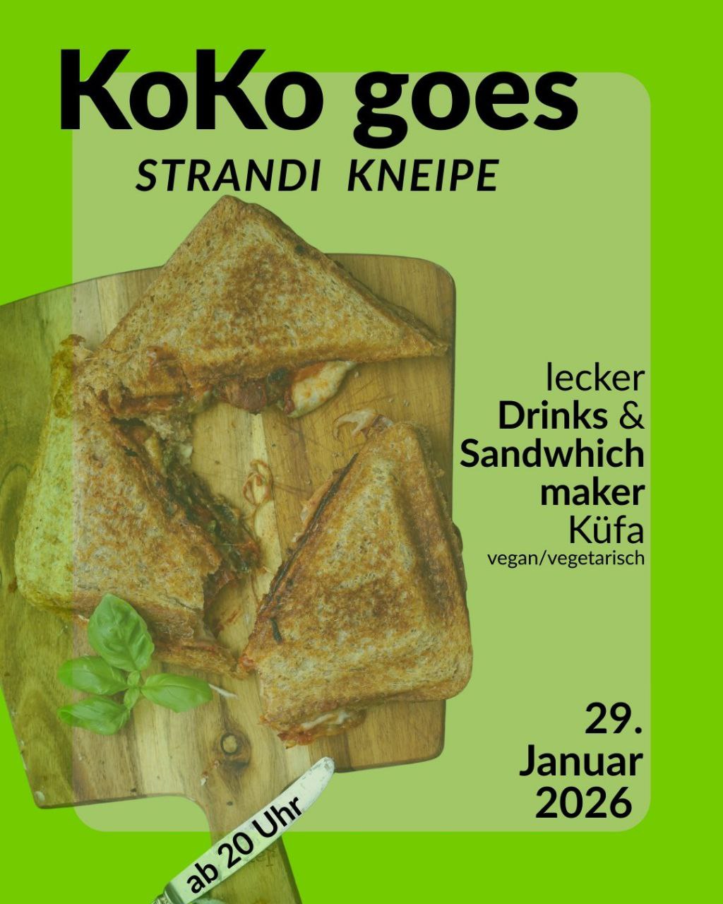 Euer Kochkollektiv lädt euch am Donnerstag, den 29. Januar ab 20 Uhr zur Kneipe in eurem Lieblings Strandcafé. Wenn ihr mit Hunger kommt, kredenzen wir euch ein Sandwich mit Wahlbelag. Spenden aus der Küfa gehen an die Rote Hilfe Freiburg. Wir freuen uns auf euch!