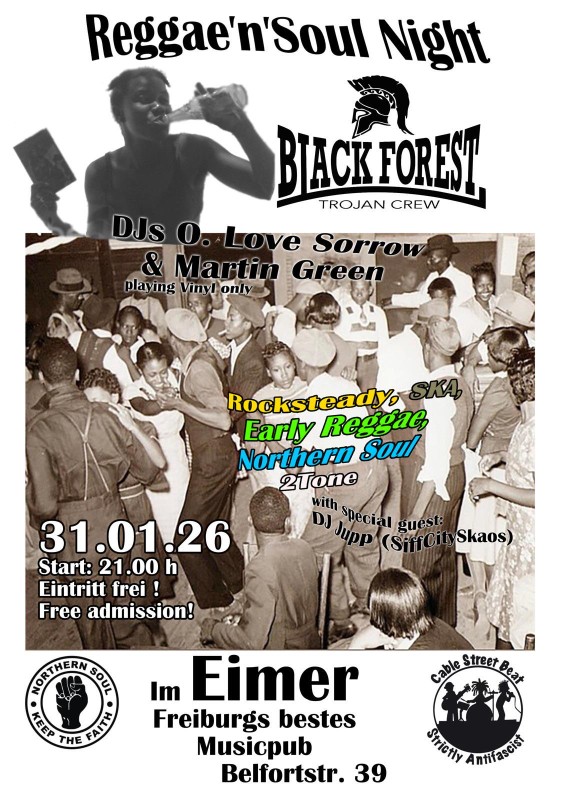 Samstag, 31.01.26 um 21:00 Uhr Eimer Musicpub O. Love Sorrow und Martin Green spielen feinsten Rocksteady, Eartly Reggae, Northern Soul und 2 Tone. Vinyl only! Specal Guest: DJ Jupp (SiffCity Skaos). Eintritt frei Type of Event Nachtleben Party