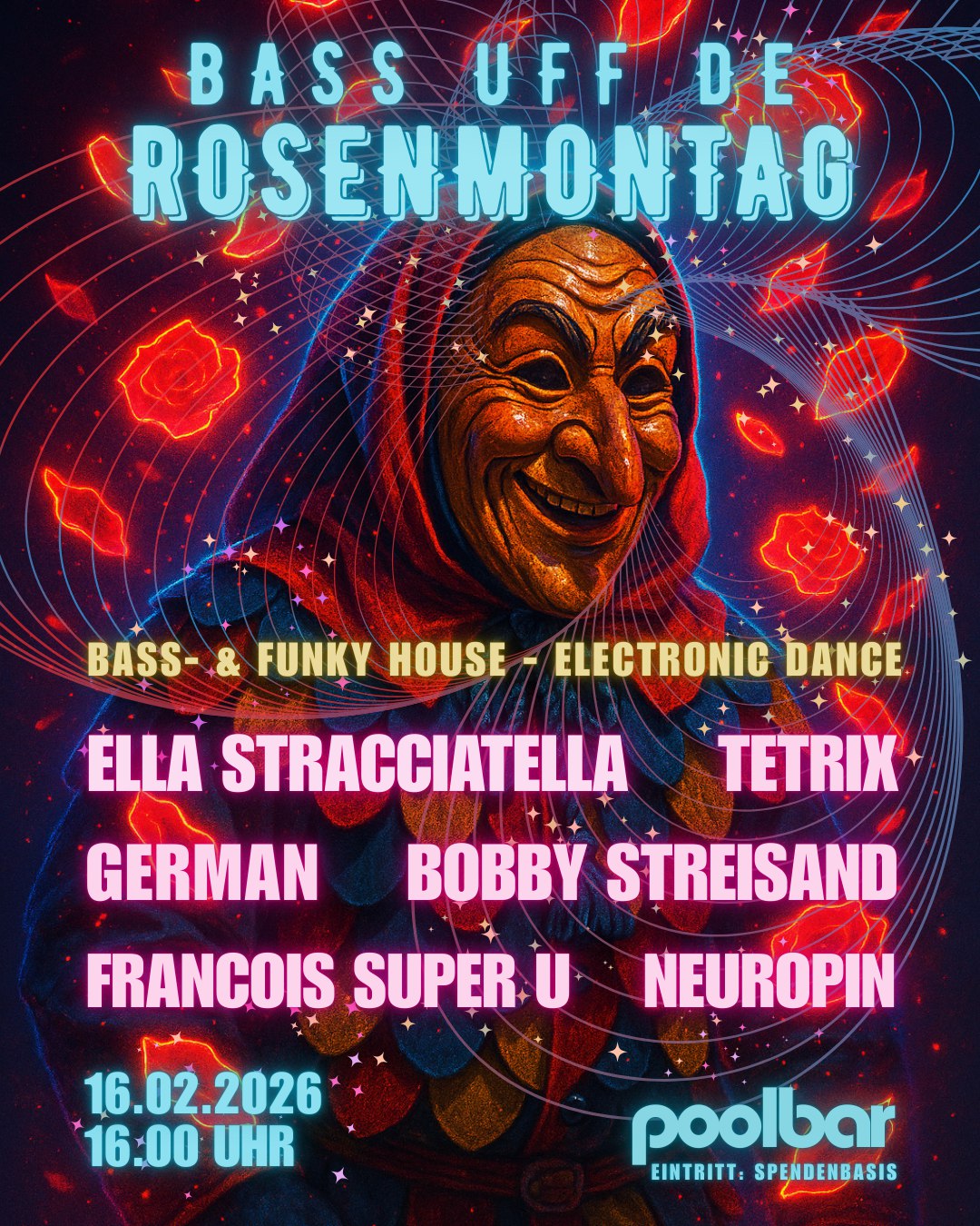 Montag, 16.02.26 um 16:00 Uhr Poolbar Electronic Dance Music am Rosenmontag mit Ella Stracciatella, German, Tetrix, Bobby Streisand, Neuropin & Francois Super U Type of Event Party