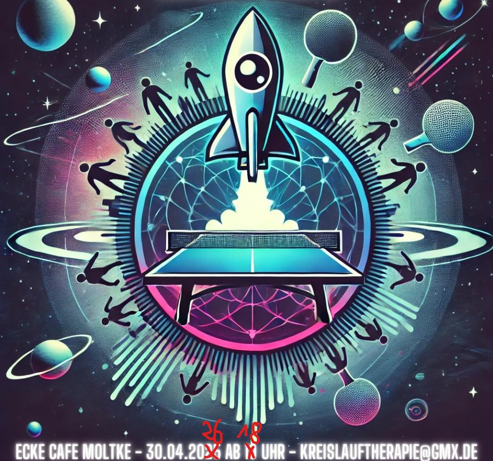 Eines wissen wir aber: Irgendwie, irgendwo, irgendwann, in der sich die Zukunft in die Vergangenheit fusioniert, findet die Kreislauftherapie statt. Am 30.04., von 17:59 bis 22:01 Uhr, gegenüber Café Moltke (Nähe Grethergelände), wollen wir gemeinsam mit euch in den Mai schmettern. Erwartungs-, anspruchs- und niveauloser Tischtennis-Rundlauf für alle mit allem. Wir versuchen es.