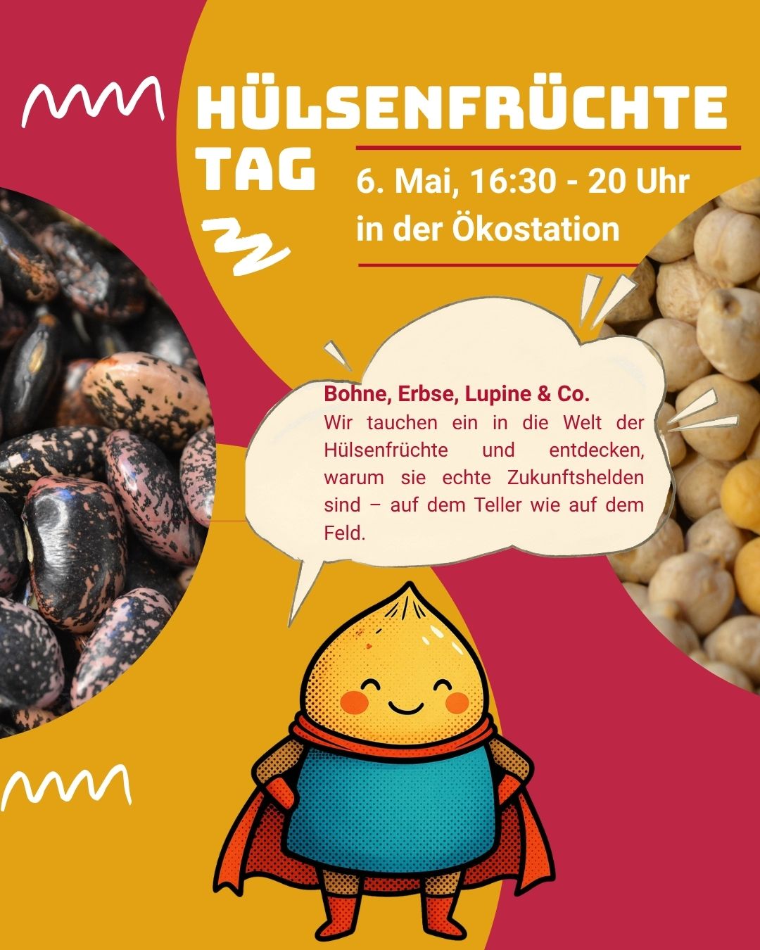 Euch erwarten spannende Vorträge, Mitmachaktionen für Kinder und Infostände. Zwischen den Programmpunkten könnt ihr außerdem Snacks mit Hülsenfrüchten probieren und die Vielfalt dieser kleinen Alleskönner selbst erleben.