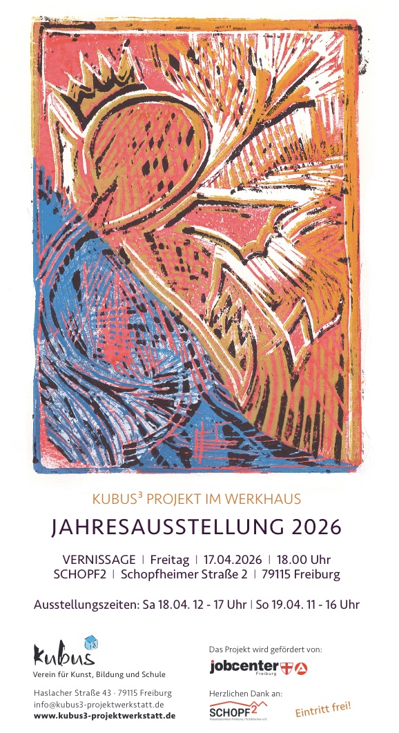 Das Kubus3 Projekt "Im Werkhaus" zeigt seine Jahresausstellung 2026 im Schopf2. Die Vernissage wird musikalisch begleitet von Matthias Hodel und Simon Werbeck. Schopf2, Schopfheimer Straße 2, 79115 Freiburg, 17. April um 18 Uhr. Der Eintritt ist frei.