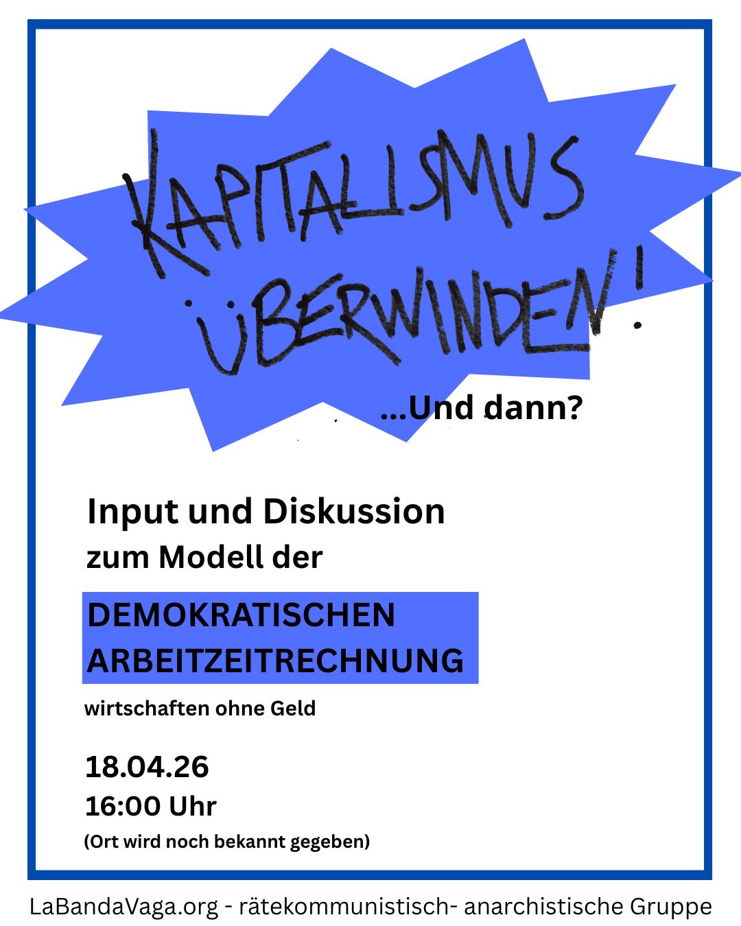 Kapitalismus überwinden! Und dann? Damit wollen wir uns beschäftigen, um Perspektiven und Transformationswege zu überlegen. Basierend auf den Gesprächen und Diskussionen unserer letzten beiden Treffen schauen wir uns die demokratische Arbeitszeitrechnung genauer an. Also gibt es einen kleinen Input dazu, und dann im Anschluss gemeinsames Grübeln und Diskussion, rund um das Thema: Wie können wir ohne Geld, ohne Ausbeutung und selbstorganisierte Wirtschaftsformen finden?
