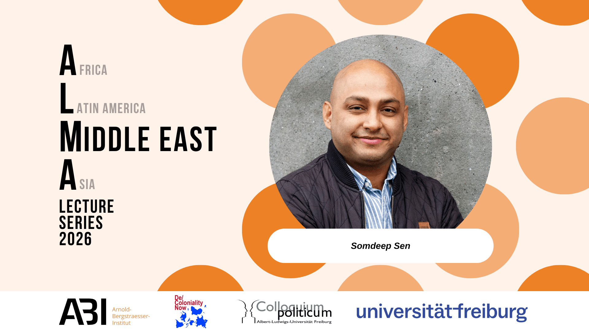 This lecture is part of the 2026 ALMA Lecture Series titled 'Global Ruptures or New Beginnings? Southern Perspectives on World Politics'. The ALMA (Africa, Latin America, Middle East and Asia) Lecture series is a series organised by the Arnold Bergstraesser Institute at the University of Freiburg in cooperation with the Colloquium Politicum addressing theoretical, empirical and methodological questions from a Global South perspective. This year’s lecture series is co-organised with the De/Coloniality Now Initiative of the University of Freiburg. This multidisciplinary initiative seeks to understand the impact of coloniality on today’s world and the ways in which people and institutions in all regions of the world, including our own, remember, perpetuate, and contest the legacy of colonialism with a focus on the present day (“now”).