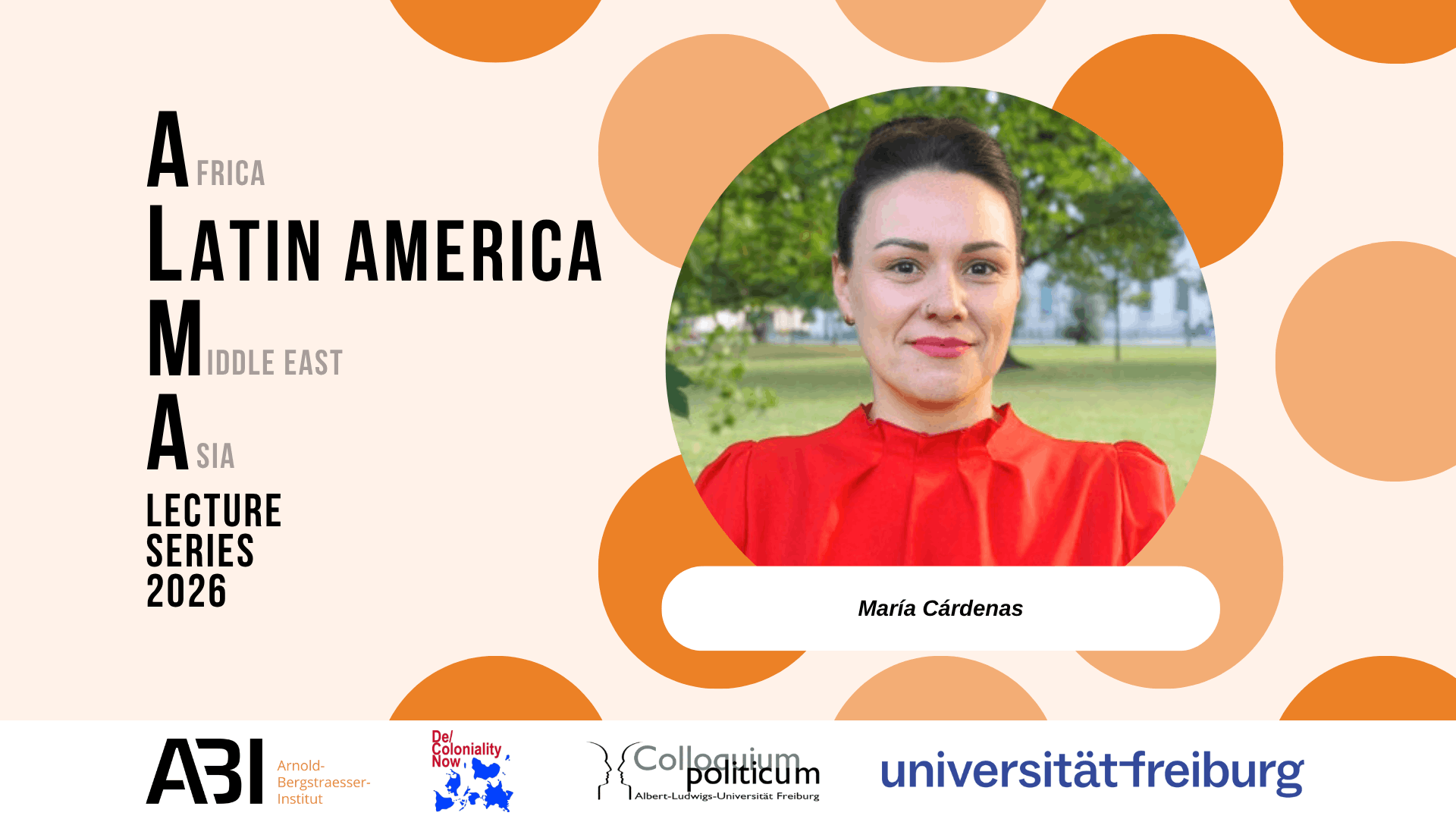 This lecture is part of the 2026 ALMA Lecture Series titled 'Global Ruptures or New Beginnings? Southern Perspectives on World Politics'. The ALMA (Africa, Latin America, Middle East and Asia) Lecture series is a series organised by the Arnold Bergstraesser Institute at the University of Freiburg in cooperation with the Colloquium Politicum addressing theoretical, empirical and methodological questions from a Global South perspective. This year’s lecture series is co-organised with the De/Coloniality Now Initiative of the University of Freiburg. This multidisciplinary initiative seeks to understand the impact of coloniality on today’s world and the ways in which people and institutions in all regions of the world, including our own, remember, perpetuate, and contest the legacy of colonialism with a focus on the present day (“now”).