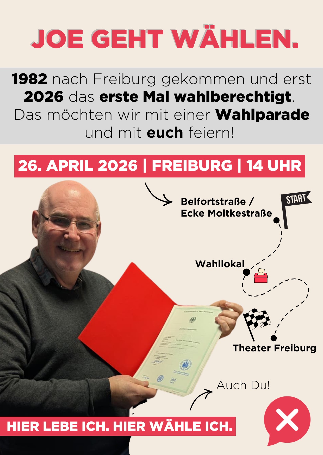 Nach 43 Jahren in Freiburg wurde Joe kürzlich eingebürgert und hat endlich das Wahlrecht. Das feiern wir mit einer bunten Parade und begleiten Joe am Tag der OB-Wahl (26. April: auch Feiertag der Demokratie!).