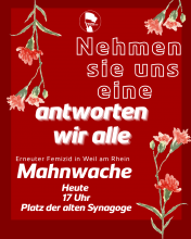 Mahnwache zum Femizid in Weil am Rhein Dienstag, 11.11.25 um 17:00 Uhr Nehmt ihr uns eine, antworten wir alle! Spontante Mahnwache Platz der Alten Synagoge