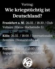 „Wir müssen kriegstüchtig werden !" Warum eigentlich ? Dienstag, 10.03.26 um 19:00 Uhr Diskussionsveranstaltung der Gruppe Widerspruch Freiburg Studierendenhaus Belfortstraße 24