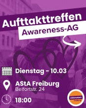 Auftakttreffen AWARENESS-AG widersetzen Dienstag, 10.03.26 um 18:00 Uhr Onboarding zur Awareness-AG in Vorbereitung auf widersetzen in Erfurt im Juli und darüber hinaus! Asta