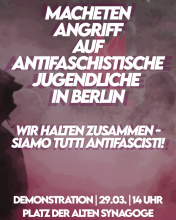 Macheten-Angriff auf antifaschistische Jugendliche in Berlin - Wehren wir uns! Sonntag, 29.03.26 um 14:00 Uhr - So., 29.03.2026 - 16:00 Wir lassen diesen Angriff nicht auf uns sitzen - Solidarität nach Berlin! Platz der Alten Synagoge