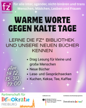 WARME WORTE GEGEN KALTE TAGE Sonntag, 14.12.25 um 15:30 Uhr - So., 14.12.2025 - 19:00 ✨ Lerne die feministische Bibliothek im fz* und unsere neuen Bücher kennen ✨ Feministisches Zentrum