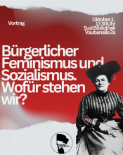 Bürgerlicher Feminismus und Sozialismus - Vortrag Mittwoch, 01.10.25 um 17:30 Uhr - Mi., 01.10.2025 - 20:00 Vortrag und Diskussion zu den Ursprüngen der Frauenbewegung und der endgültigen Überwindung des Patriarchats susi Vaubanallee 2a, Bibliothek