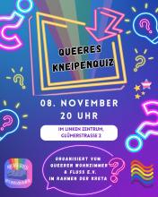 Queeres Kneipenquiz von FLUSS e.V. und dem Queeren Wohnzimmer Samstag, 08.11.25 um 20:00 Uhr Linkes Zentrum Freiburg (LiZ)